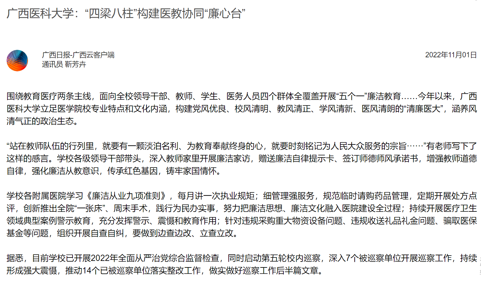 近日,《广西日报》报道了我校“四梁八柱”构建医教协同“廉心台”。