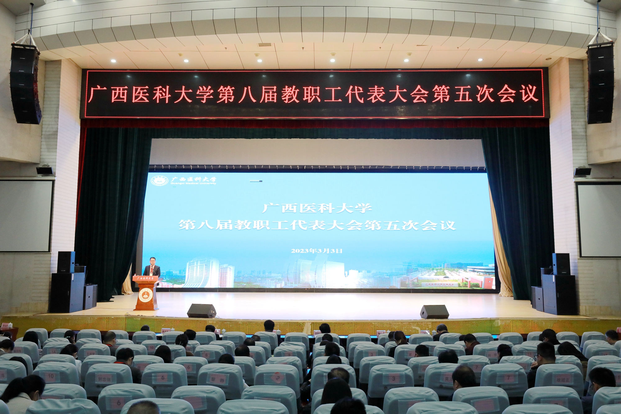 2023年3月3日,我校第八届教职工代表大会第五次会议在南宁-校本部图书馆演讲厅召开。校领导、教代会代表、列席、特邀代表出席会议。会议由学校党委常委、副校长卿云波主持。