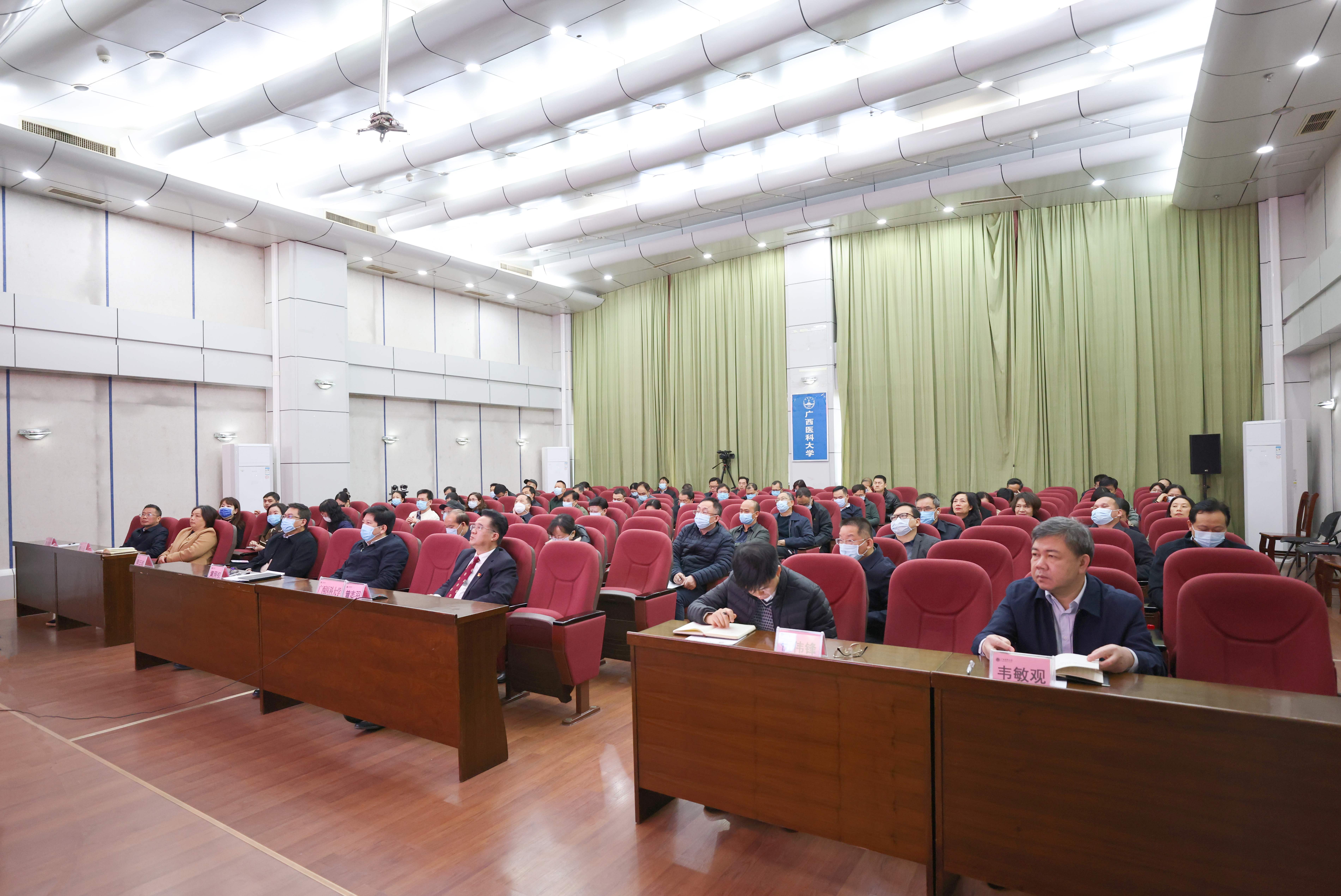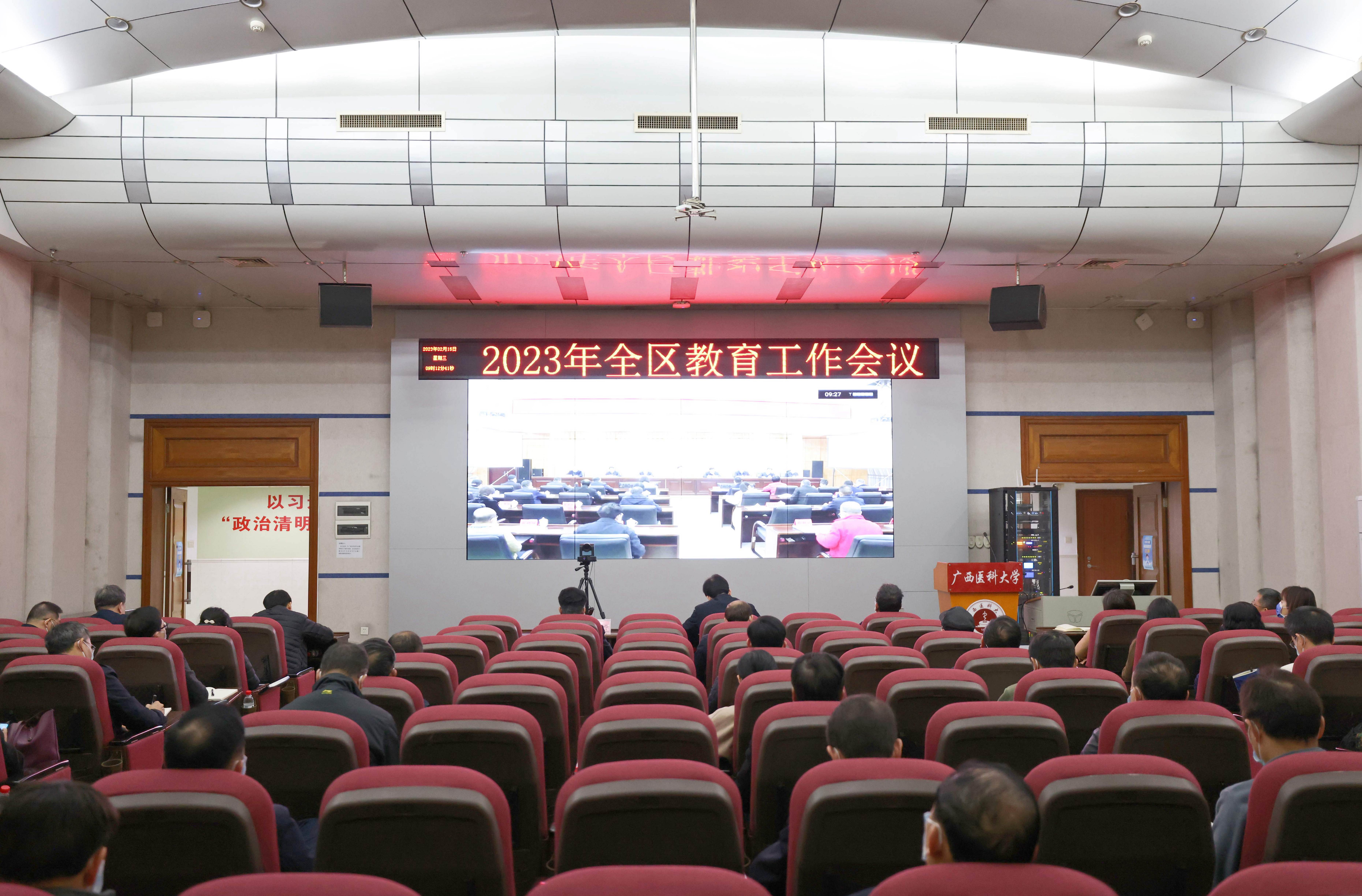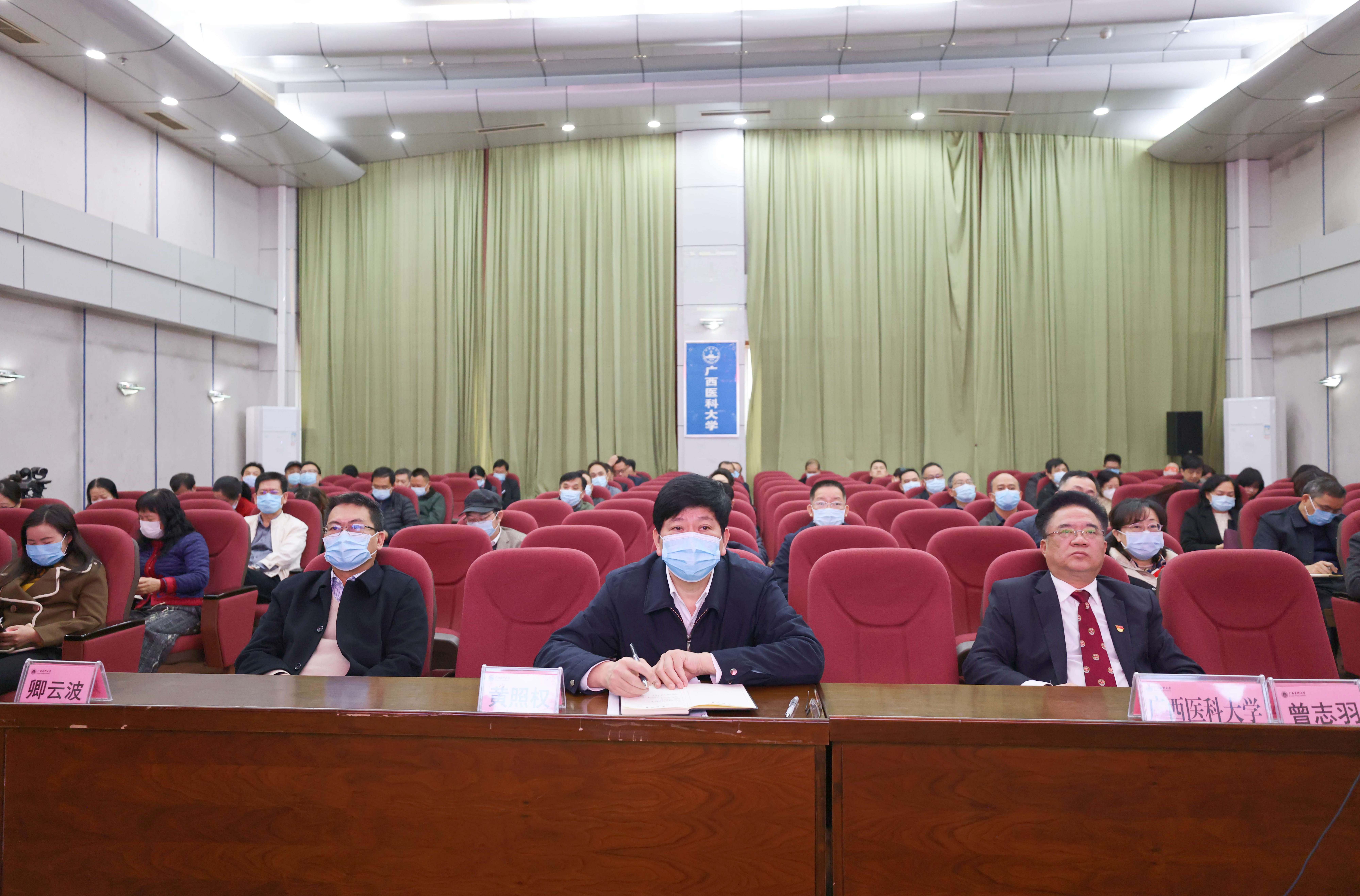 我校在南宁—校本部综合楼九楼报告厅设置分会场,学校党委书记黄照权、校长曾志羽等全体校领导、各党政部门负责人、各二级学院党委书记、院长在分会场参加会议。